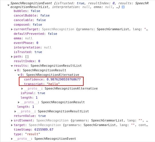 SpeechRecognitionEventthì thuộc tính quan trọng nhất của nó làresults, danh sách các đối tượngSpeechRecognitionResult. Sau khi ngừng lắng nghe sẽ trả về một đối tượngresult.SpeechRecognitionResulttrả về kết quả là danh sách các đối tượngSpeechRecognitionAlternative, đối tượng này có 2 thuộc tính:- transcript: bản ghi những gì mà chúng ta đã nói thông qua microphone